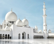 阿布達比大清真寺,將信仰化為建築的極致。潔白大理石映著金光與藍天,八十二座圓頂與千根石柱構築出近乎超現實的對稱之美。陽光穿越水池與花紋投影。這座清真寺不僅是宗教聖地,更是阿拉伯工藝與當代設計的結晶。當暮色降臨,穹頂浮現銀色微光,莊嚴而溫柔,宏偉卻寧靜。